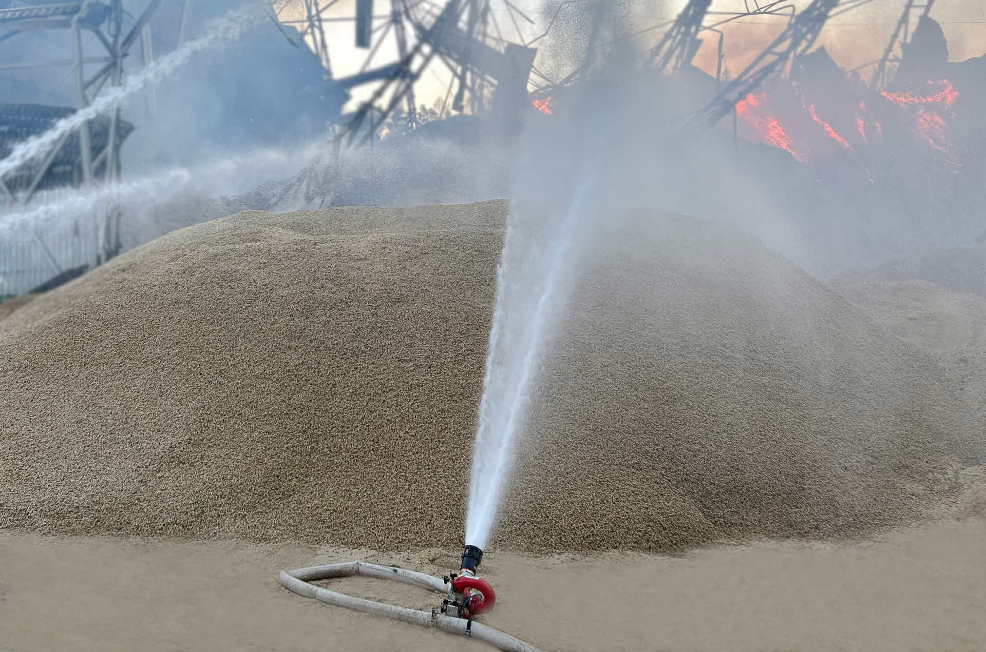 När släckningsarbetet var klart hade den stora mängden pellets blivit mestadels sågspån. Pellets suger upp flera gånger sin egen vikt i vätska och sväller då tills den faller isär. Det var precis det som hände när den utsattes för stora mängder vatten under släckningen.